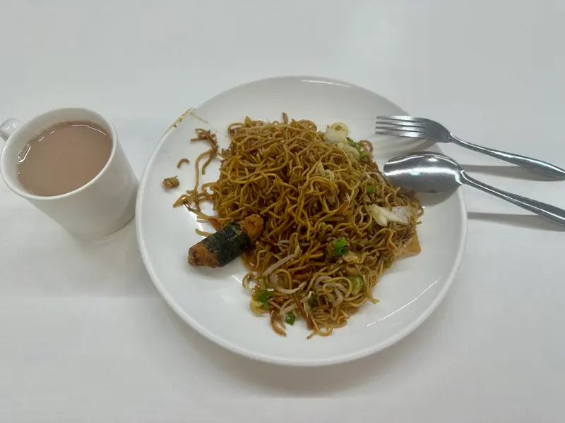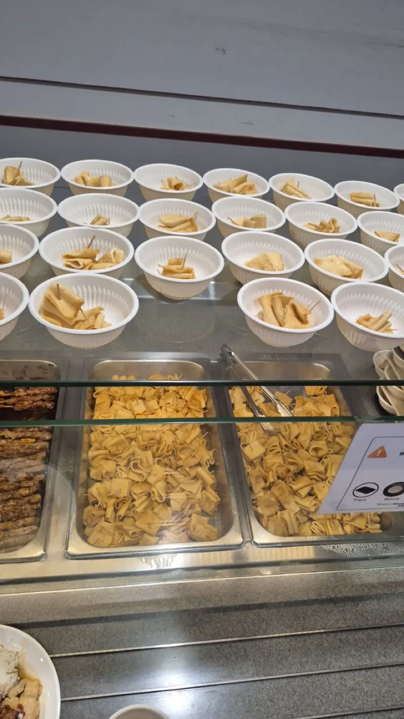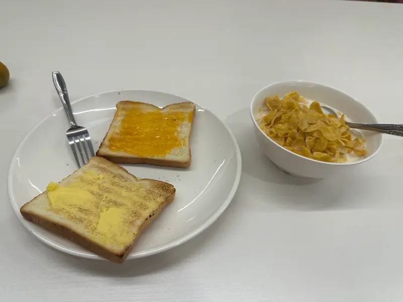 早餐的部分大概是會有一個主食(炒麵、炒飯),粥(海鮮、肉絲),麵包(漢堡、三明治、熱狗堡),麥片,有的時候會有一些其他的(腸粉、薯泥、豆花),每天都會有烤麵包無限供應,果醬可能會不同(草莓、咖椰、花生、奶油)。飲了的部分會有 milo 或豆漿,每天都有咖啡和茶。一點的話就是可以選一樣,要多選就是多掃,一餐最多可以用三點。