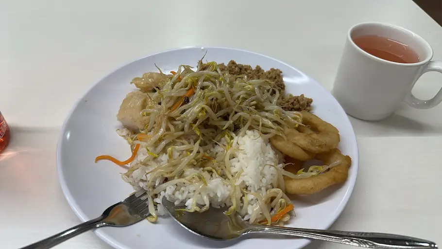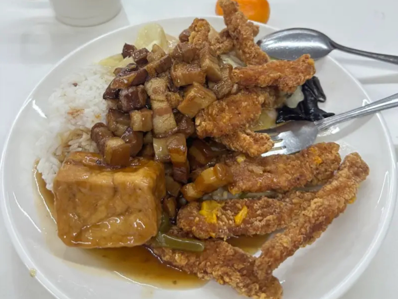 有一天週日我比較晚去吃,大約8:40,叔叔們準備要下班了,就請我幫忙關燈,還幫我加餐,原本一個只有大約4條雞肉,直接幫我另外加兩大匙,大概有十隻,以及一勺東剖肉,越吃越多,超飽