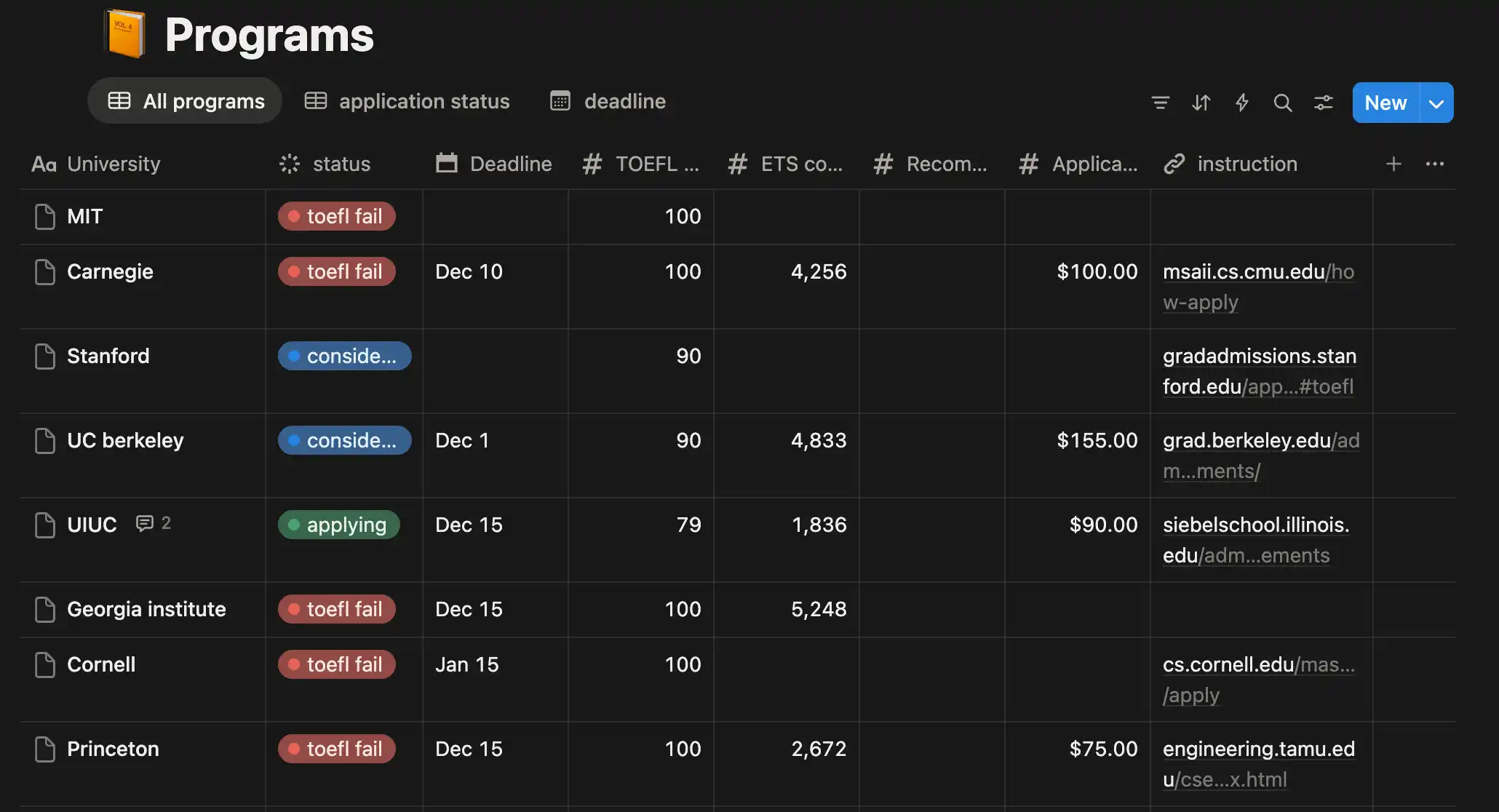 In my case, I started by listing all the top 30 programs in a Notion page and checking the requirements of each one. In some sense, it was lucky that my test scores were not perfect, because that automatically eliminated some programs from my list.