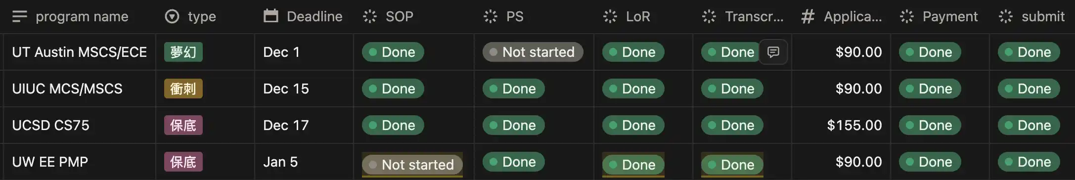 在開始撰寫文件之前,你應該仔細確認每個項目需要哪些資料。例如:履歷(CV)、讀書計畫(SOP)以及推薦信的數量。因為細節太多了,我把這些要求放進Notion中以便追蹤。最重要的是,確認每個項目的截止日期,並盡早開始申請流程。有些問題只會出現在申請系統中,而且可能需要花幾天時間才能註冊好申請帳號。所以,盡量先登入系統並瀏覽所有頁面,確認你需要提供哪些內容。