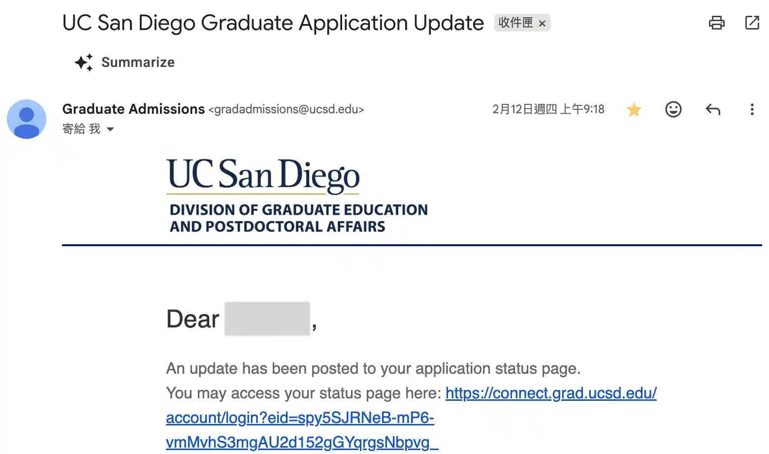 某個早晨,在參加完一場輔導課後,我打開Gmail,看到一封信說我的申請狀態已經更新。點開時我甚至一點都不緊張,因為完全沒想到會這麼快收到回覆。
